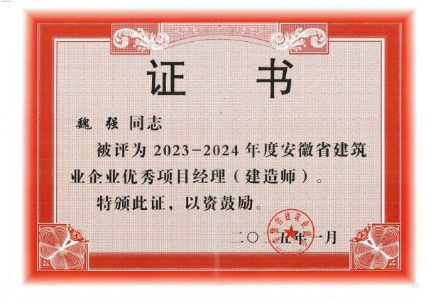 喜訊!蚌埠江河公司項目經理魏強榮獲“2023-2024年度安徽省建筑業企業優秀項目經理”稱號